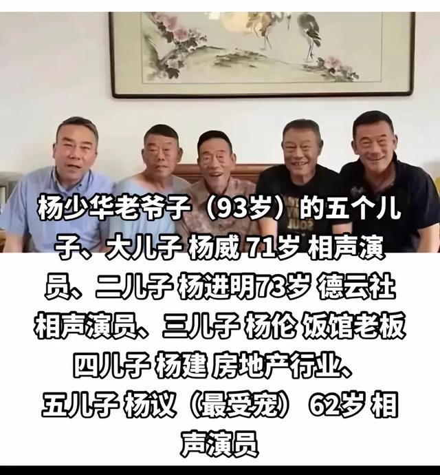老大杨威71岁子承父业,也是一名相声演员,老二杨进明73岁是义子,杨老师大哥的儿子,也是一名相声演员,老三杨伦是一位饭馆老板,老四杨建从事房地产行业,老五杨议62岁也是杨老爷子最喜爱的一个儿子,每次都是“宝贝宝贝”的叫着,听的人心都化了,满满的父爱,令不少人羡慕不已!